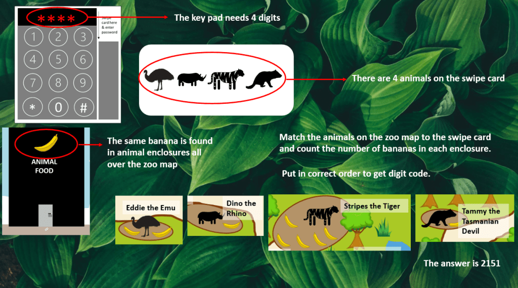 Hint 4: Count the number of bananas in each of the swipe card animal enclosures.