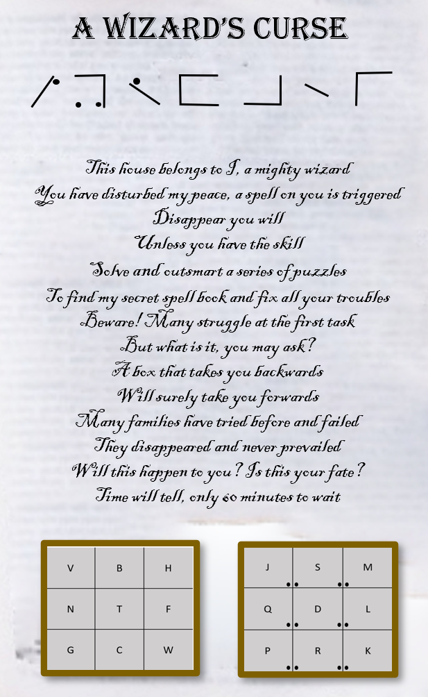 The Wizard’s Curse: Puzzle 1 You begin looking around the attic to find things that might help to solve the riddle…. Once you’ve solved it and have the three digit code click NEXT. Remember to use your hints if you get stuck. NEXT Hint 1 Hint 2 Hint 3 Hint 4 Answer